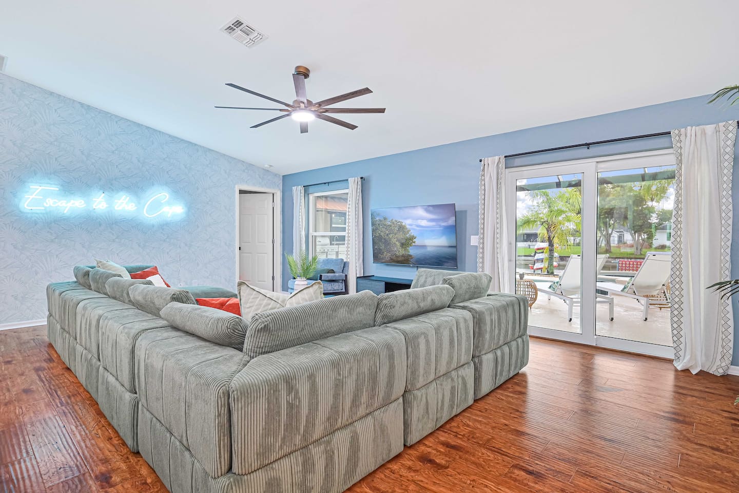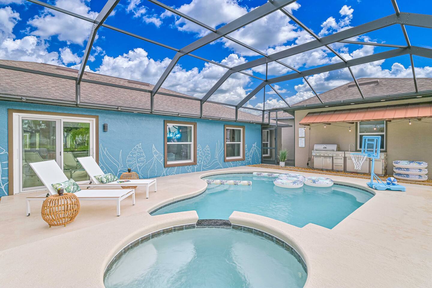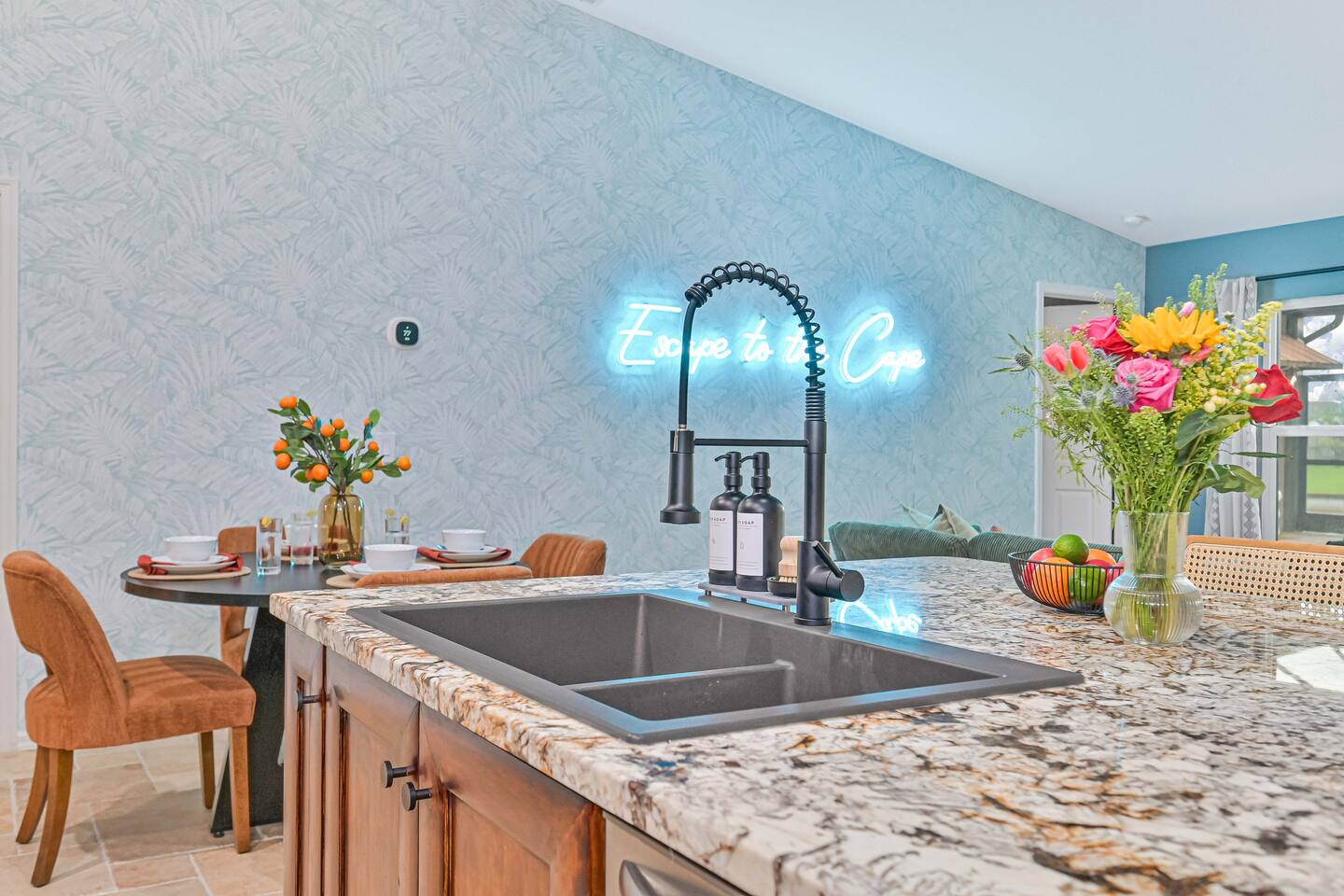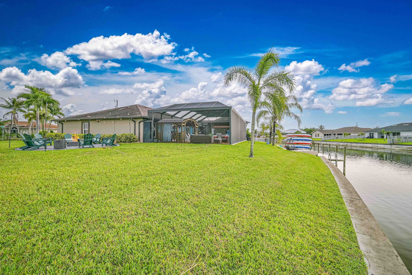Discover your slice of paradise at The Lily Pad, a bright and breezy tropical getaway nestled along the peaceful freshwater canals of sun-soaked Cape Coral, Florida. Designed with families, friends, and adventurers in mind, this 4-bedroom, 2-bath retreat offers unforgettable experiences for guests of all ages—whether you're kayaking at sunset, challenging your swing on the indoor golf simulator, watching movies in the private cinema, or just soaking up the Florida sun by the saltwater pool.