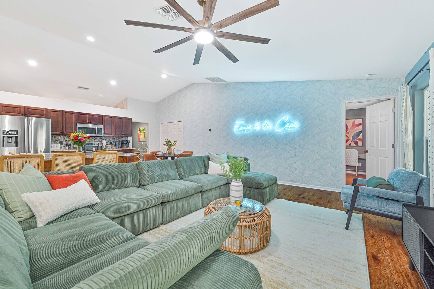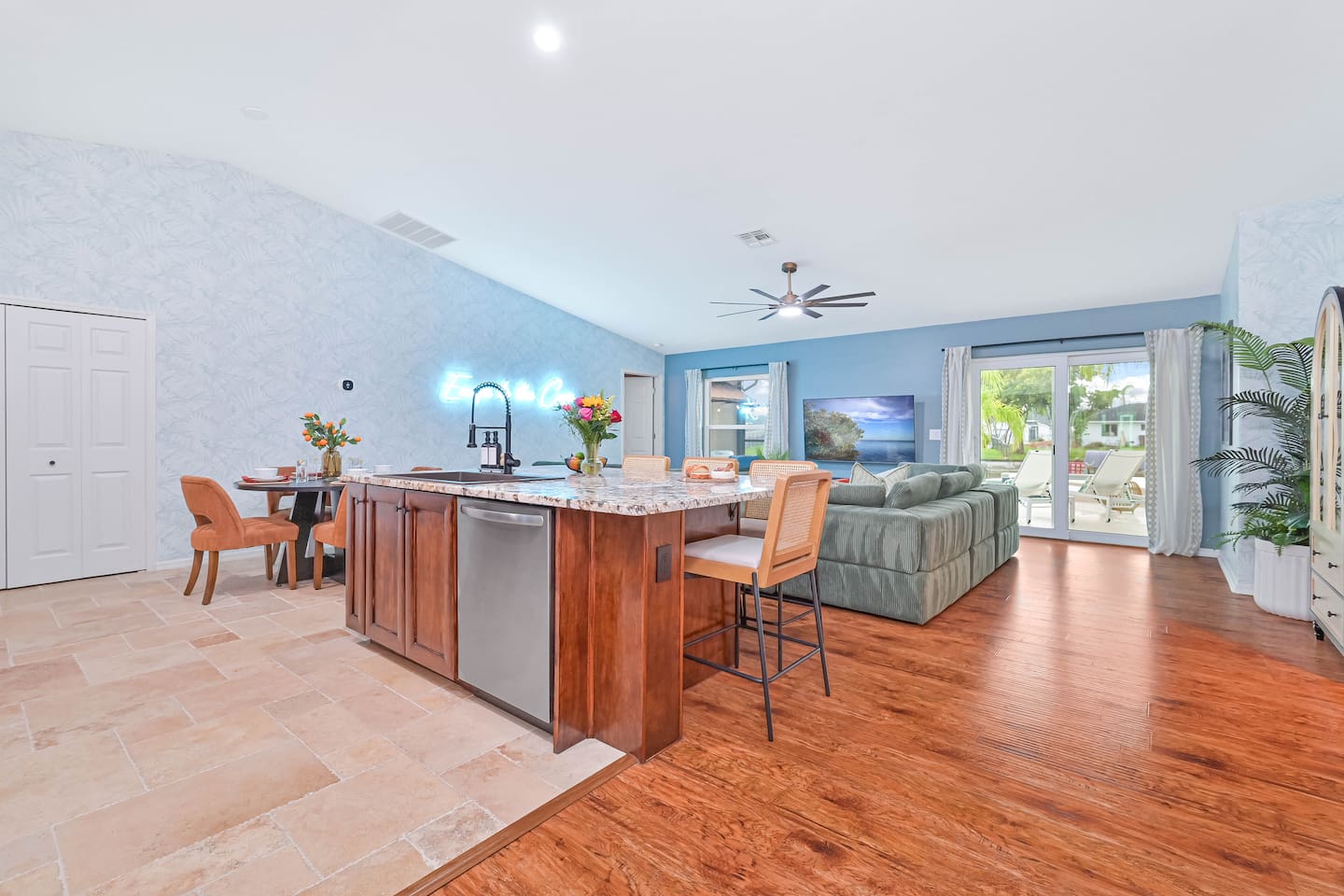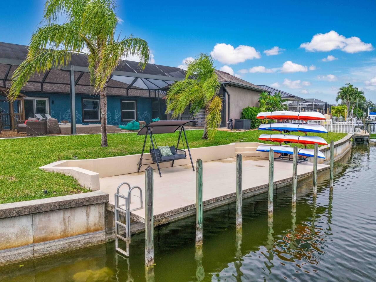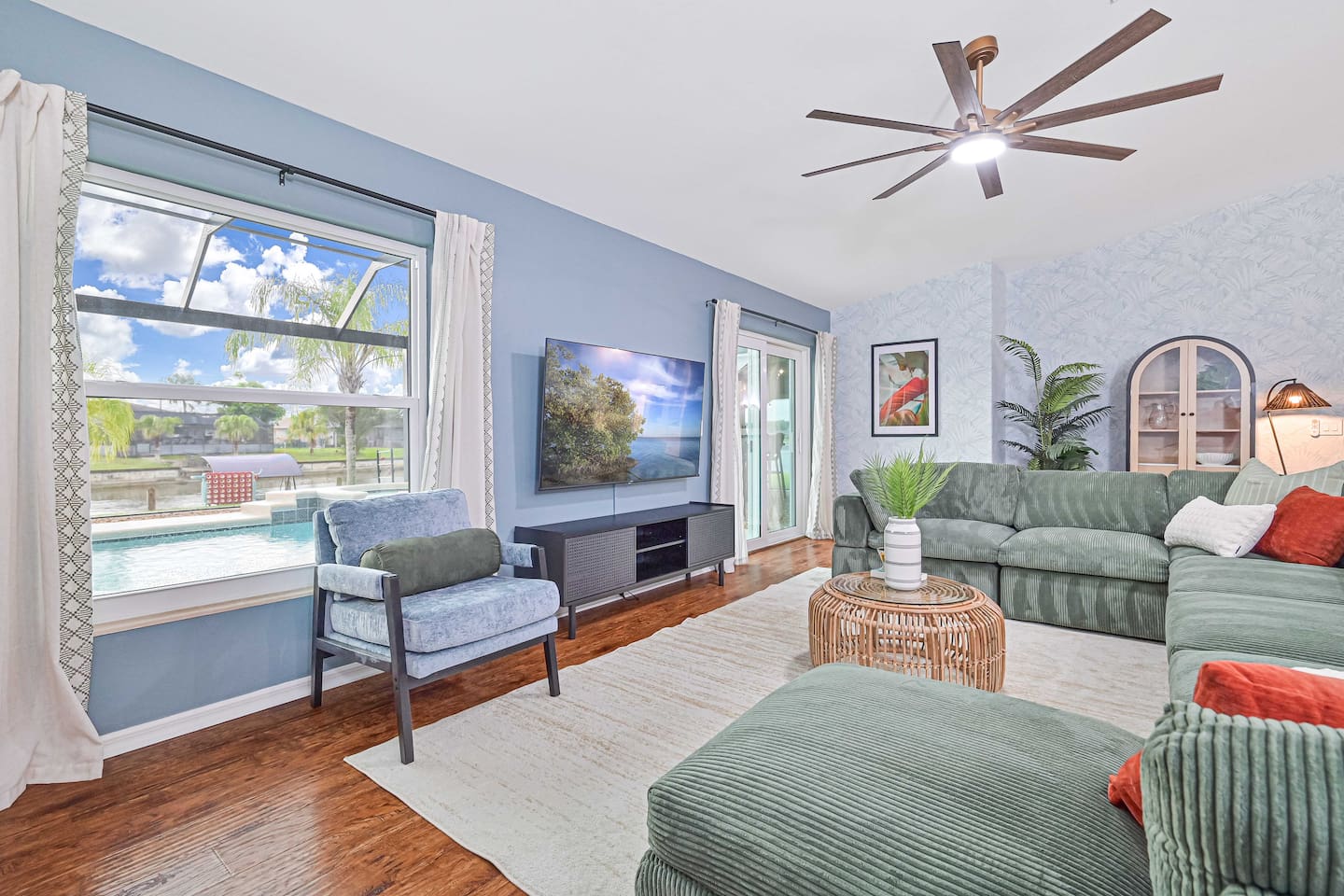 Discover your slice of paradise at The Lily Pad, a bright and breezy tropical getaway nestled along the peaceful freshwater canals of sun-soaked Cape Coral, Florida. Designed with families, friends, and adventurers in mind, this 4-bedroom, 2-bath retreat offers unforgettable experiences for guests of all ages—whether you're kayaking at sunset, challenging your swing on the indoor golf simulator, watching movies in the private cinema, or just soaking up the Florida sun by the saltwater pool.