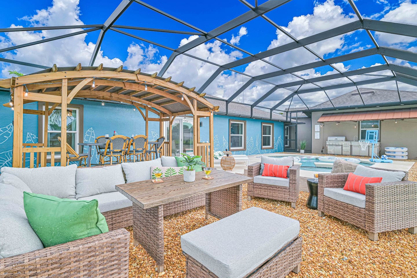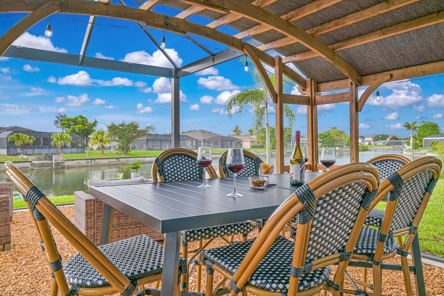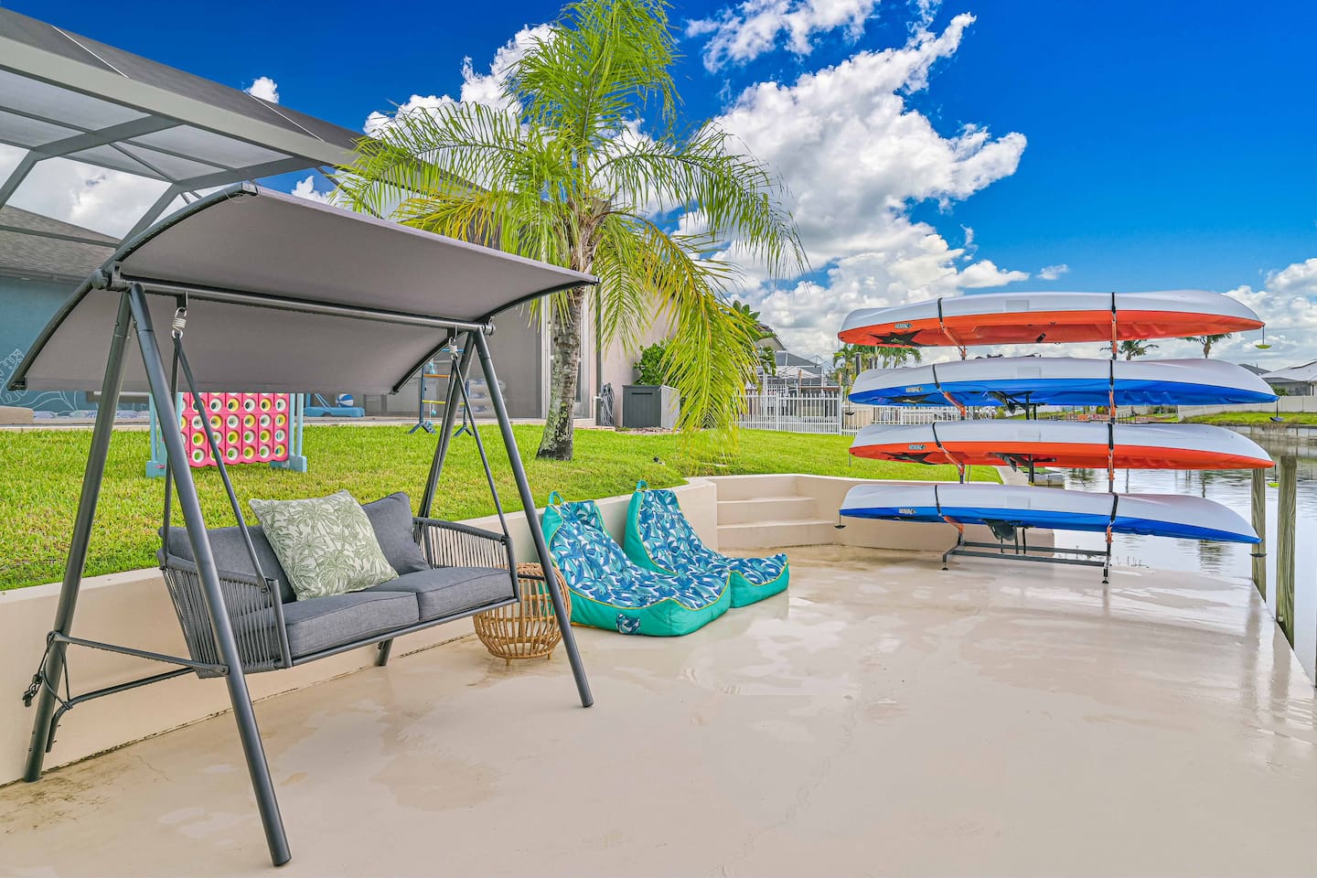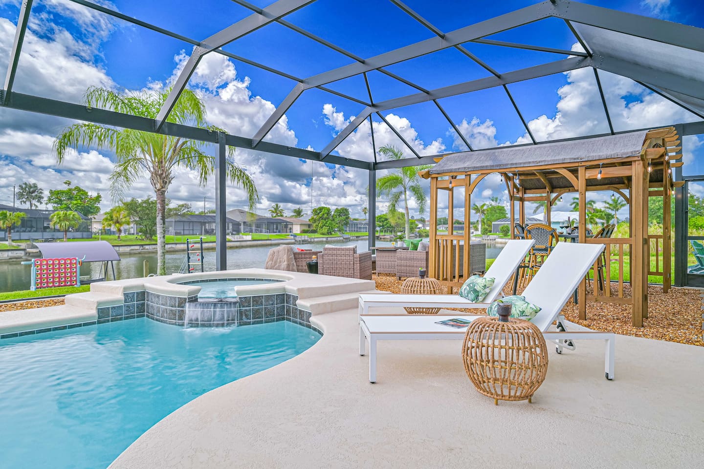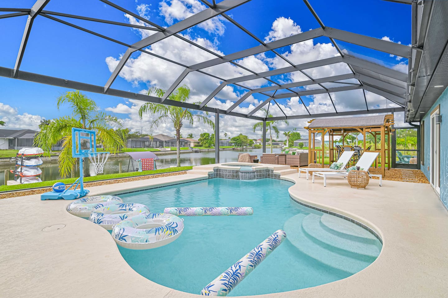 🌴 Welcome to The Lily Pad – Your Cape Coral Waterfront Escape! 🌴 ✨ Highlights You’ll Love: Heated saltwater pool & spa – With pool floaties and toys provided Private dock – Launch one of 4 kayaks, go fishing or relax by the water Ultimate Game Room – Features a golf simulator, arcade games, pool table, ping pong, air hockey, and foosball Full movie room – 135” projector screen, theater seating & popcorn machine Outdoor propane fire pit – For cozy evenings under the stars Yard games – Ladder ball, giant Jenga, basketball hoop, 4-in-a-row, and more Fully stocked beach gear – 10 chairs, umbrella, cooler, body boards, towels & toys Family friendly – Pack ’n Play, high chair, and bunk room for kids. Extra lock on the patio door to the pool for safety. Stylish tropical design & décor – Bright, modern, and thoughtfully curated for a true vacation vibe 🏡 Inside the Home: Spacious Living Area: An open-concept layout with comfortable seating, large windows, and peaceful canal views—perfect for relaxing, playing games, or enjoying quality time together. Chef’s Kitchen & Dining: A fully equipped kitchen awaits, stocked with everything you need to prepare delicious home-cooked meals. When it’s time to dine, choose between the spacious main dining table that seats 8, the sunny breakfast nook for 4, or pull up a stool at the kitchen island with seating for 4—plenty of room for everyone to gather, share stories, and enjoy great food together. Private Theater Room: Your private cinema experience awaits! Sink into comfy recliners, grab a fresh bucket of popcorn, and enjoy your favorite films on the 135” projector screen. Game Room Fun: Step into a true entertainment zone featuring a high-quality golf simulator—easy to use with an iPad and app, it’s perfect for practicing your swing or enjoying a casual round with friends right from the comfort of home. Plus, enjoy classic arcade games, a pool table, ping pong, air hockey, and foosball for nonstop fun for kids, teens, and adults alike. Bedrooms for Everyone: The Lily Pad comfortably sleeps up to 14 guests. The spacious master suite features a king-size bed and a private en suite bathroom, offering a peaceful retreat after a day of fun. The vibrant bunk room is perfect for kids or groups, with four full-size beds that provide plenty of space and comfort. Two additional beautifully decorated bedrooms offer relaxing accommodations—one with a queen-size bed, and the other with a king-size bed—making The Lily Pad ideal for families, friends, and multi-generational stays. Laundry Room: For your comfort and convenience, The Lily Pad includes a fully equipped laundry room with a washer, dryer, and a drying rack—perfect for swimsuits and beach towels after a day in the sun. You'll also find an iron, ironing board, and clothing steamer to keep everything looking fresh during your stay. ☀️ Outdoor Oasis: Step outside into your own private tropical retreat—spacious, scenic, and designed for both relaxation and play. The generous outdoor area features a screened-in lanai with a heated saltwater pool and spa, surrounded by pool loungers, a cushioned outdoor sofa, and a large dining table for al fresco meals. Fire up the gas grill for a poolside barbecue, or float the day away with the included pool floaties and toys. Step beyond the lanai to your oversized private dock, complete with a swinging bench—perfect for watching sunsets, fishing, or launching one of the four provided kayaks for a paddle along the peaceful canal. As evening falls, unwind under string lights, enjoy a dip in the lighted pool, or gather around the propane fire pit for a perfect end to the day. 🌴 Why Choose The Lily Pad? Packed with entertainment – Enjoy a golf simulator, movie theater, game room, pool, kayaks, and more Family-friendly amenities – Includes Pack ’n Play, high chair, bunk room, beach gear, and outdoor games Comfort & convenience – Fast Wi-Fi, Smart TVs, fully equipped kitchen, laundry room, and spacious living areas Great location – Easy access to beaches, restaurants, shopping, and local attractions in Cape Coral and Fort Myers 📅 Book your stay at The Lily Pad today and experience the best of Cape Coral—where fun, relaxation, and unforgettable memories are just a click away!