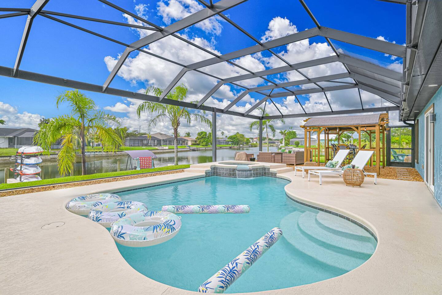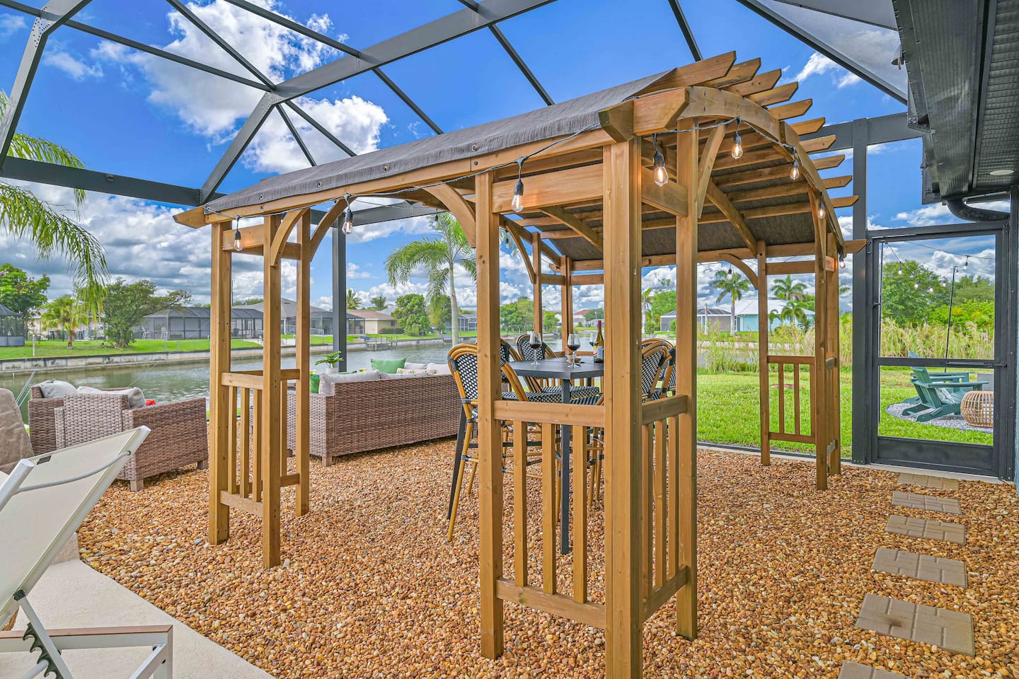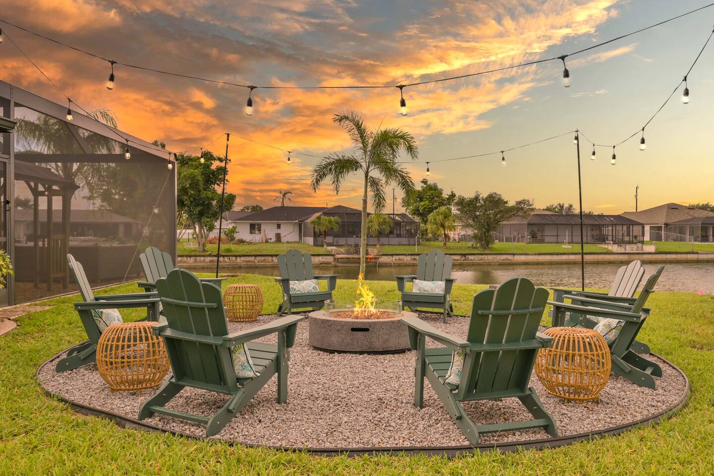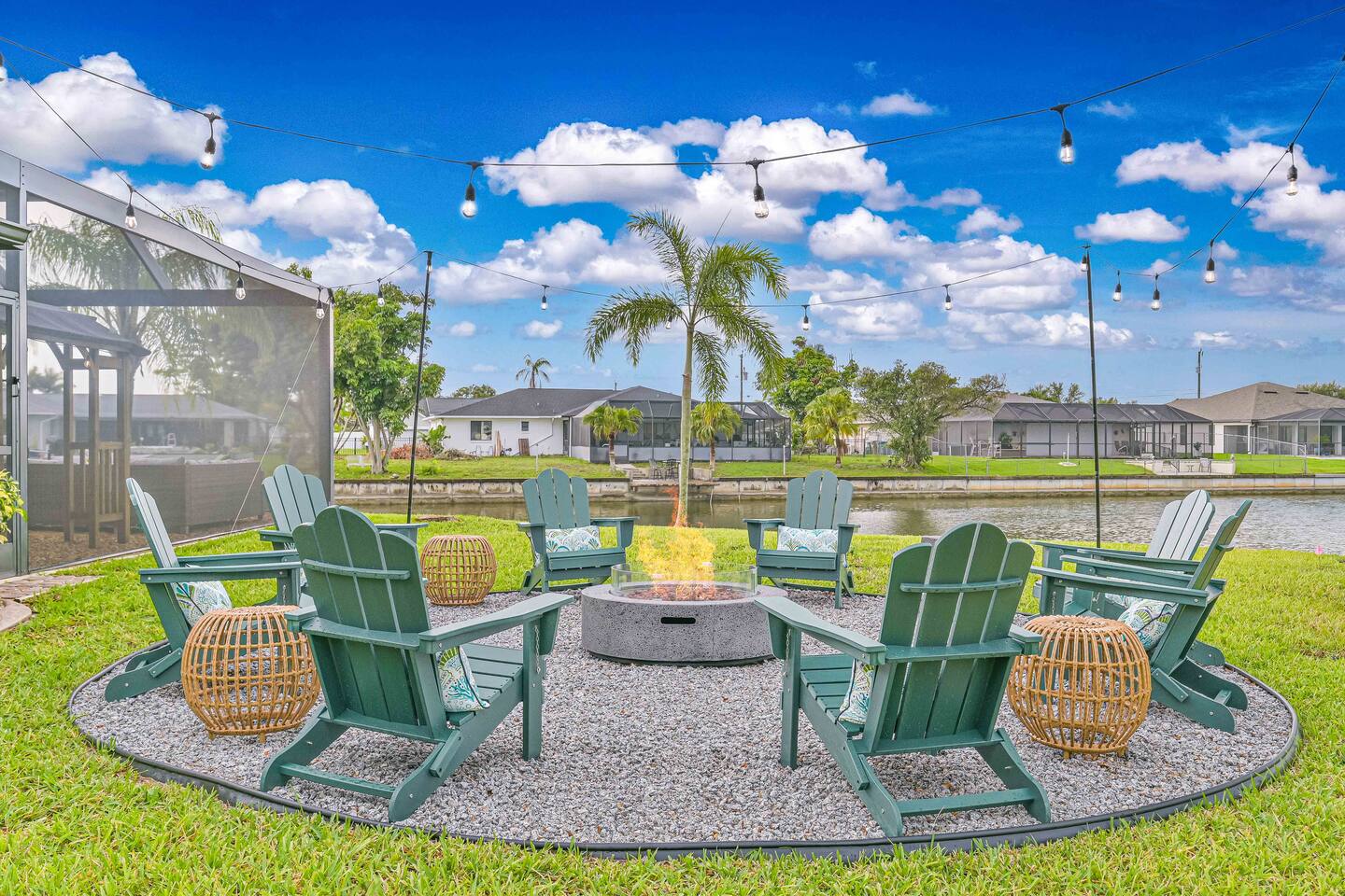 Open-concept living with stunning canal views, fully equipped kitchen, laundry, and 4 bedrooms sleeping 14. Enjoy a movie theater, game room with golf simulator, arcade games, plus indoor and yard games. Outdoor oasis with screened lanai, heated saltwater pool & spa, grill, oversized dock with kayaks, fire pit, and plenty of seating. Family-friendly with beach gear, located close to Cape Coral and Fort Myers beaches, dining, and shops.