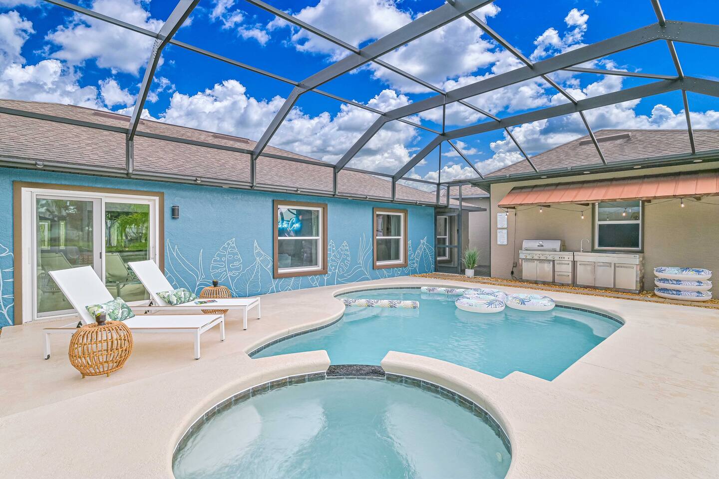 🌴 Welcome to The Lily Pad – Your Cape Coral Waterfront Escape! 🌴 ✨ Highlights You’ll Love: Heated saltwater pool & spa – With pool floaties and toys provided Private dock – Launch one of 4 kayaks, go fishing or relax by the water Ultimate Game Room – Features a golf simulator, arcade games, pool table, ping pong, air hockey, and foosball Full movie room – 135” projector screen, theater seating & popcorn machine Outdoor propane fire pit – For cozy evenings under the stars Yard games – Ladder ball, giant Jenga, 4-in-a-row, and more Fully stocked beach gear – 10 chairs, umbrella, cooler, body boards, towels & toys Family friendly – Pack ’n Play, high chair, and bunk room for kids. Extra lock on the patio door to the pool for safety. Stylish tropical design & décor – Bright, modern, and thoughtfully curated for a true vacation vibe 🏡 Inside the Home: Spacious Living Area: An open-concept layout with comfortable seating, large windows, and peaceful canal views—perfect for relaxing, playing games, or enjoying quality time together. Chef’s Kitchen & Dining: A fully equipped kitchen awaits, stocked with everything you need to prepare delicious home-cooked meals. When it’s time to dine, choose between the spacious main dining table that seats 8, the sunny breakfast nook for 4, or pull up a stool at the kitchen island with seating for 4—plenty of room for everyone to gather, share stories, and enjoy great food together. Private Theater Room: Your private cinema experience awaits! Sink into comfy recliners, grab a fresh bucket of popcorn, and enjoy your favorite films on the 135” projector screen. Game Room Fun: Step into a true entertainment zone featuring a high-quality golf simulator—easy to use with an iPad and app, it’s perfect for practicing your swing or enjoying a casual round with friends right from the comfort of home. Plus, enjoy classic arcade games, a pool table, ping pong, air hockey, and foosball for nonstop fun for kids, teens, and adults alike. Bedrooms for Everyone: The Lily Pad comfortably sleeps up to 14 guests. The spacious master suite features a king-size bed and a private en suite bathroom, offering a peaceful retreat after a day of fun. The vibrant bunk room is perfect for kids or groups, with four full-size beds that provide plenty of space and comfort. Two additional beautifully decorated bedrooms offer relaxing accommodations—one with a queen-size bed, and the other with a king-size bed—making The Lily Pad ideal for families, friends, and multi-generational stays. Laundry Room: For your comfort and convenience, The Lily Pad includes a fully equipped laundry room with a washer, dryer, and a drying rack—perfect for swimsuits and beach towels after a day in the sun. You'll also find an iron, ironing board, and clothing steamer to keep everything looking fresh during your stay. ☀️ Outdoor Oasis: Step outside into your own private tropical retreat—spacious, scenic, and designed for both relaxation and play. The generous outdoor area features a screened-in lanai with a heated saltwater pool and spa, surrounded by pool loungers, a cushioned outdoor sofa, and a large dining table for al fresco meals. Fire up the gas grill for a poolside barbecue, or float the day away with the included pool floaties and toys. Step beyond the lanai to your oversized private dock, complete with a swinging bench—perfect for watching sunsets, fishing, or launching one of the four provided kayaks for a paddle along the peaceful canal. As evening falls, unwind under string lights, enjoy a dip in the lighted pool, or gather around the propane fire pit for a perfect end to the day. 🌴 Why Choose The Lily Pad? Packed with entertainment – Enjoy a golf simulator, movie theater, game room, pool, kayaks, and more Family-friendly amenities – Includes Pack ’n Play, high chair, bunk room, beach gear, and outdoor games Comfort & convenience – Fast Wi-Fi, Smart TVs, fully equipped kitchen, laundry room, and spacious living areas Great location – Easy access to beaches, restaurants, shopping, and local attractions in Cape Coral and Fort Myers 📅 Book your stay at The Lily Pad today and experience the best of Cape Coral—where fun, relaxation, and unforgettable memories are just a click away!